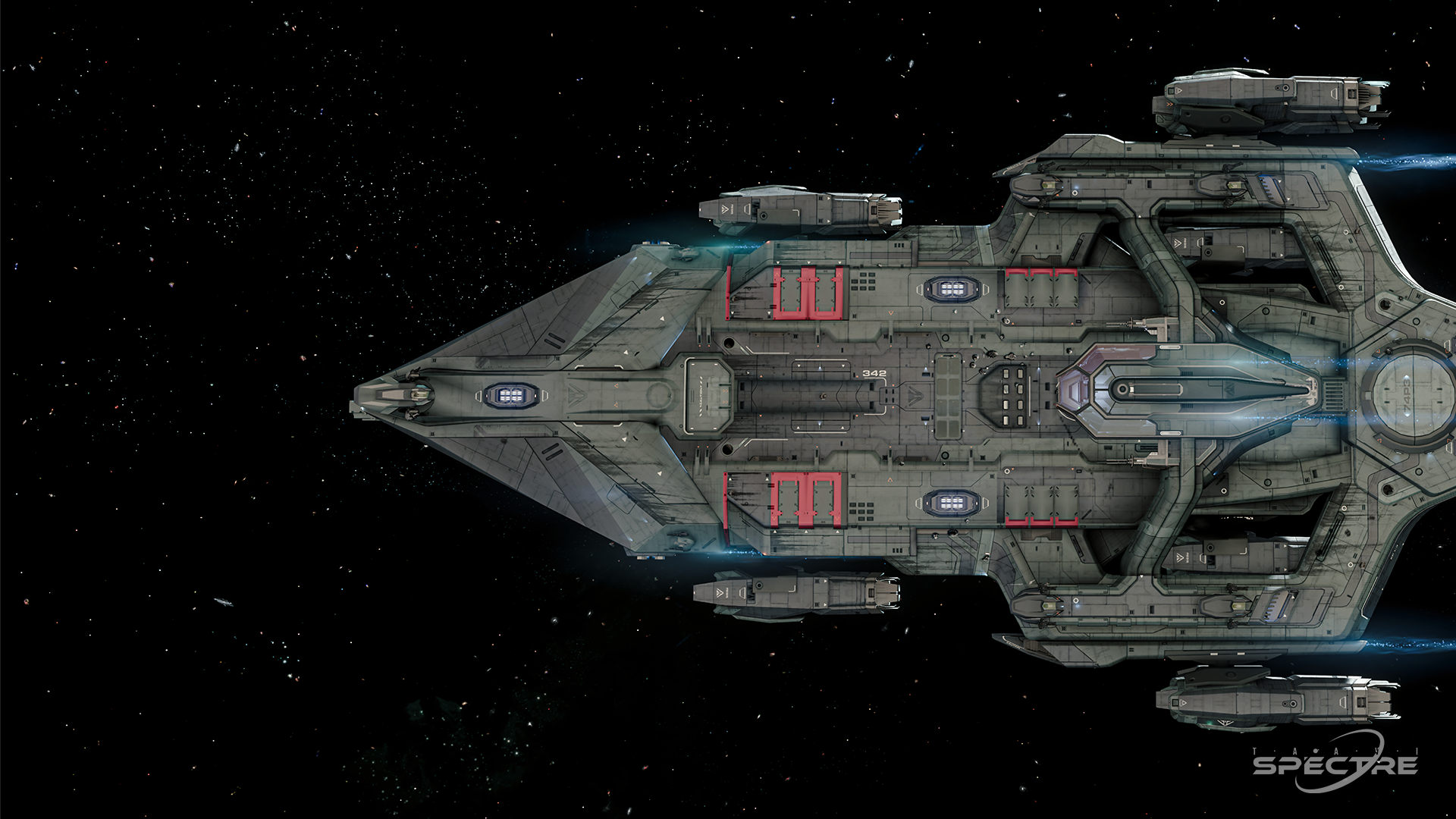 A heavy silhouette drifts through fractured space, surrounded by debris and shadow. The composition emphasizes mass, surface wear, and the unmistakable presence of a capital-class frame.