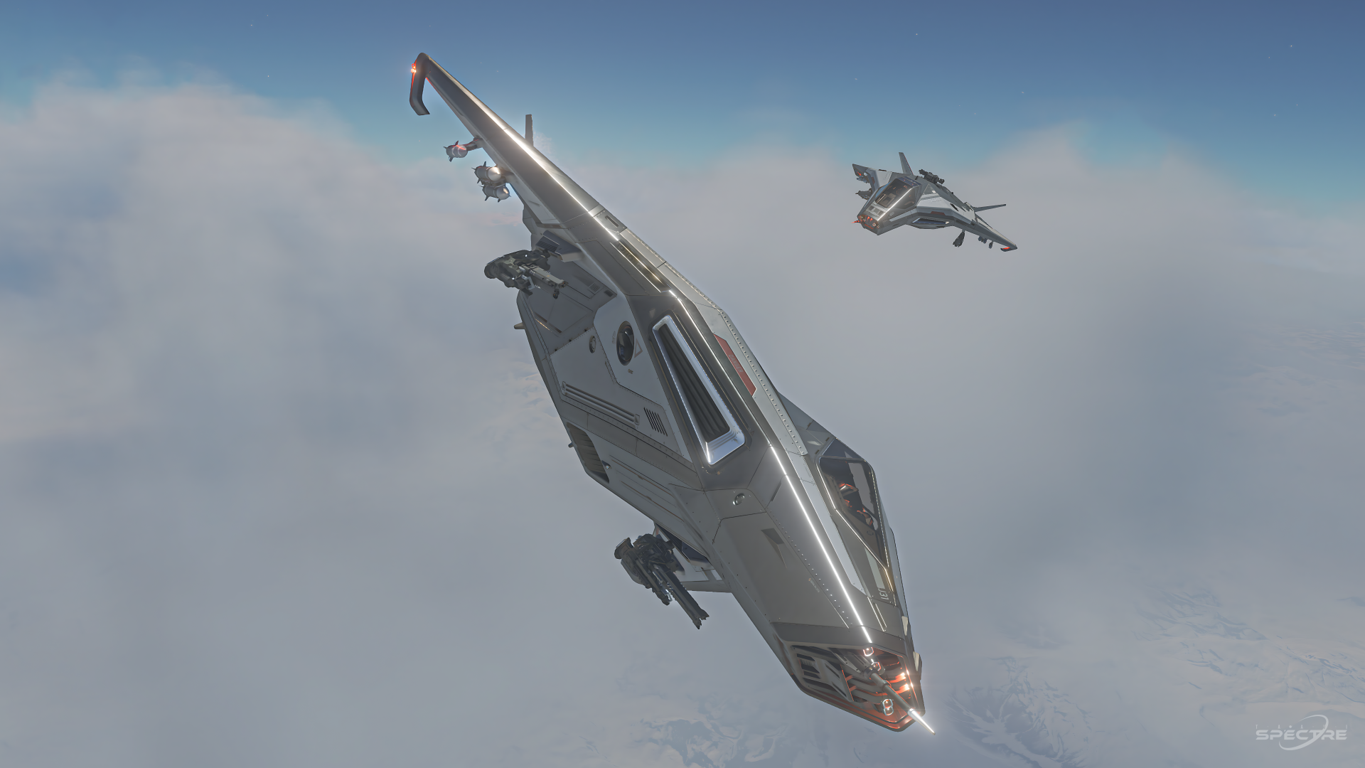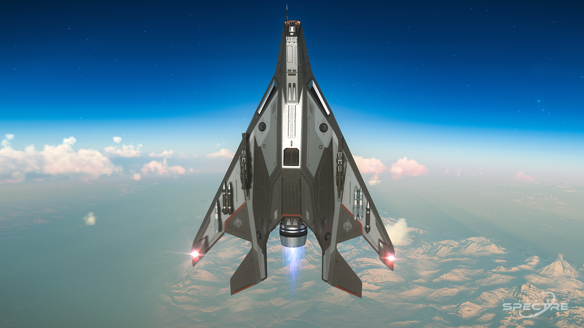 Slim proportions and sharp control surfaces define the Anvil Arrow, a light fighter in Star Citizen built around speed and visual precision. Its narrow fuselage and forward-leaning stance give it a kinetic presence in both space and atmosphere. When framed in motion, the Arrow translates its interceptor role into clean silhouettes and high-contrast compositions driven by agility and restraint.