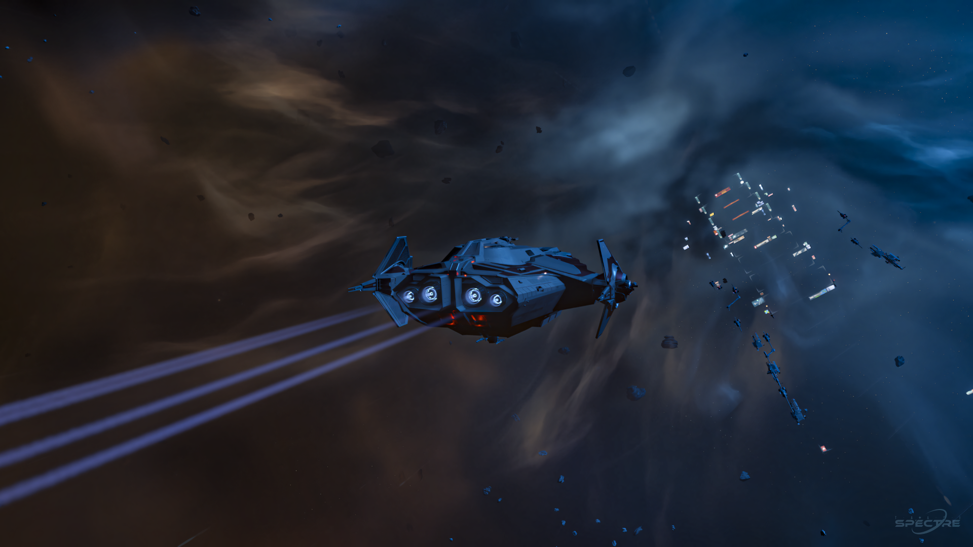 A heavy silhouette drifts through fractured space, surrounded by debris and shadow. The composition emphasizes mass, surface wear, and the unmistakable presence of a capital-class frame.